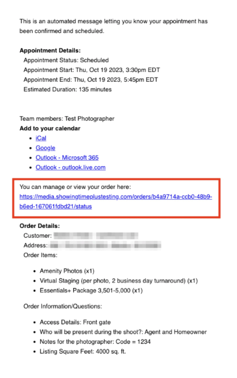 After booking the shoot or rescheduling, you’ll receive a confirmation email confirming the new time and date of the shoot. If any changes need to be made, you can also manage the appointment from the confirmation email.